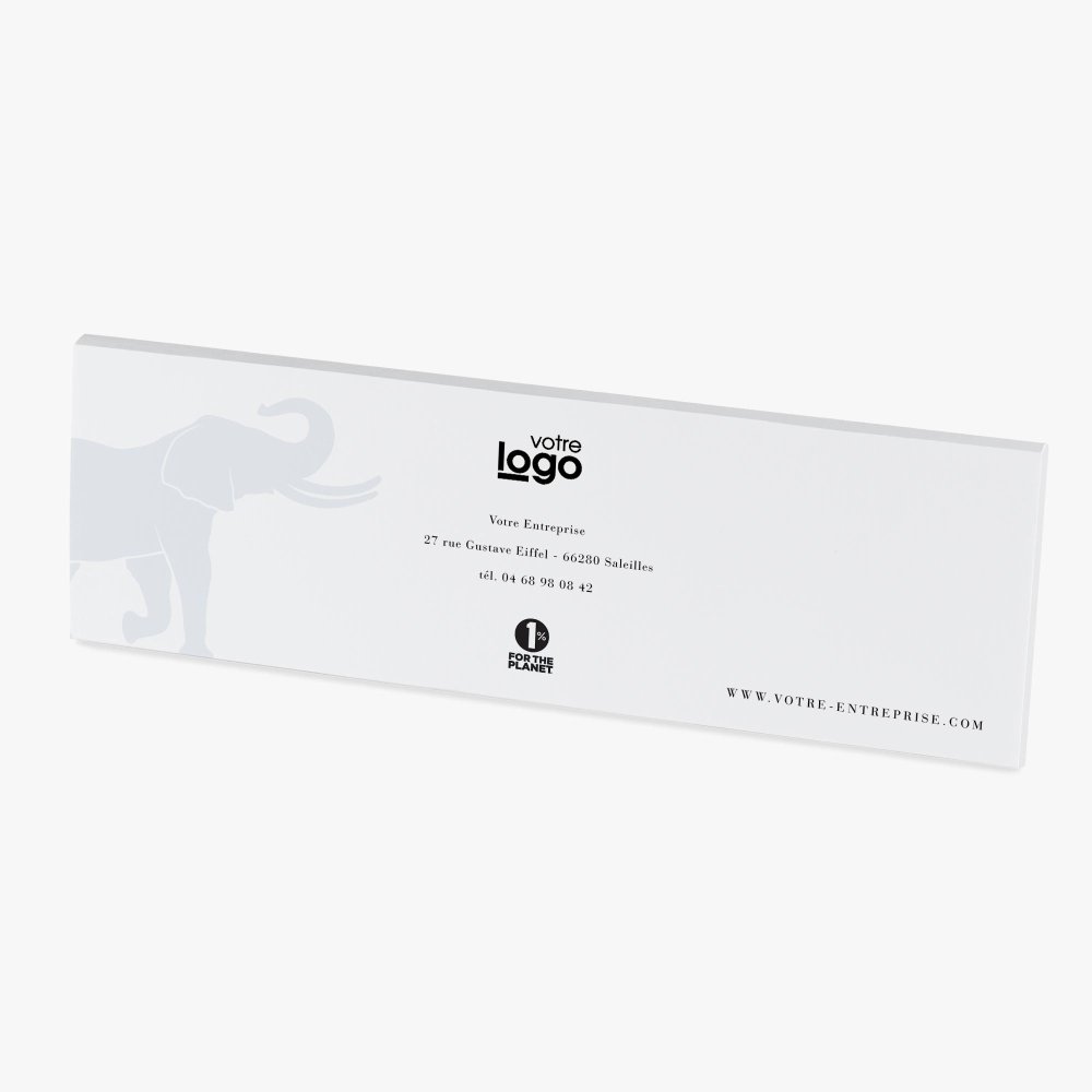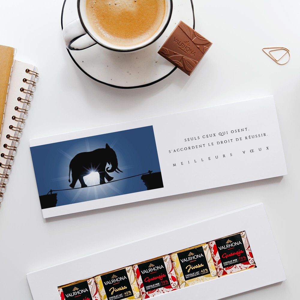 Nos étuis chocolats se personnalisent avec le logo de votre entreprise, vos contacts et adresse postale, ainsi que celle de votre site web. Un espace est également dédié à la formulation de vos vœux professionnels.