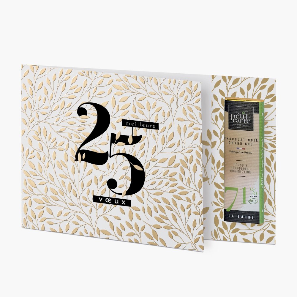 Démarquez-vous avec cette carte de vœux aussi gourmande qu'élégante ! Sur cette charmante attention, une petite pochette avec deux chocolats de dégustation accompagne vos vœux.